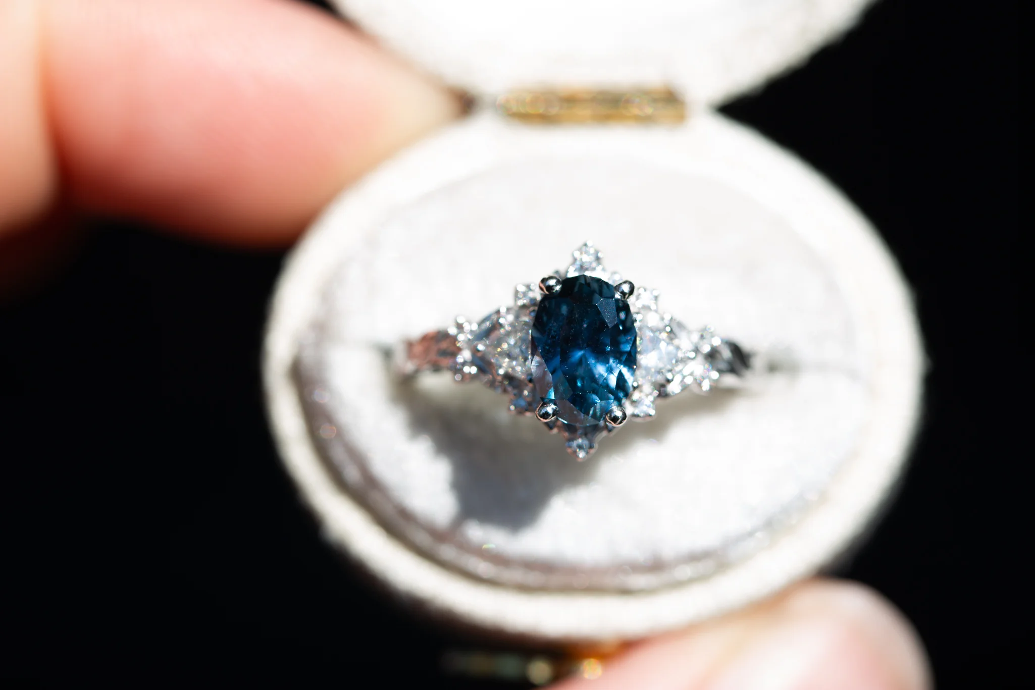 -1.47ct, 7.5x5.2mm heated Montana sapphire, trademarked regal radiant cut by John Dyer. This stone is a darker blue color