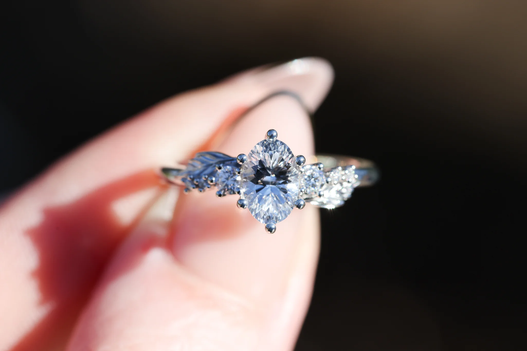 - Center: 1.20ct oval natural white sapphire, Madagascar origin unheated. This has a unique facet pattern that makes the stone catch the light so beautifully