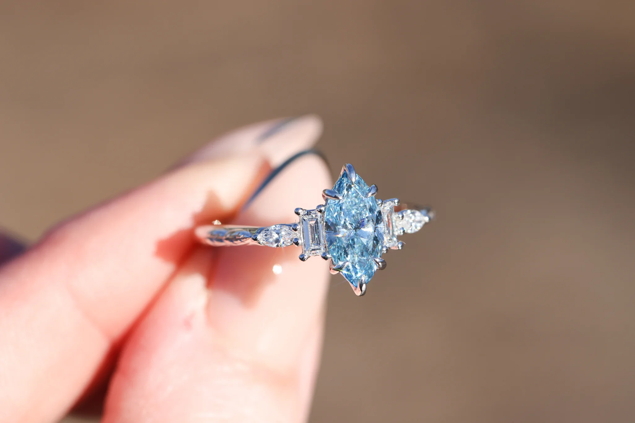 - Center: 1.25ct marquise blue lab diamond IGI 657462917